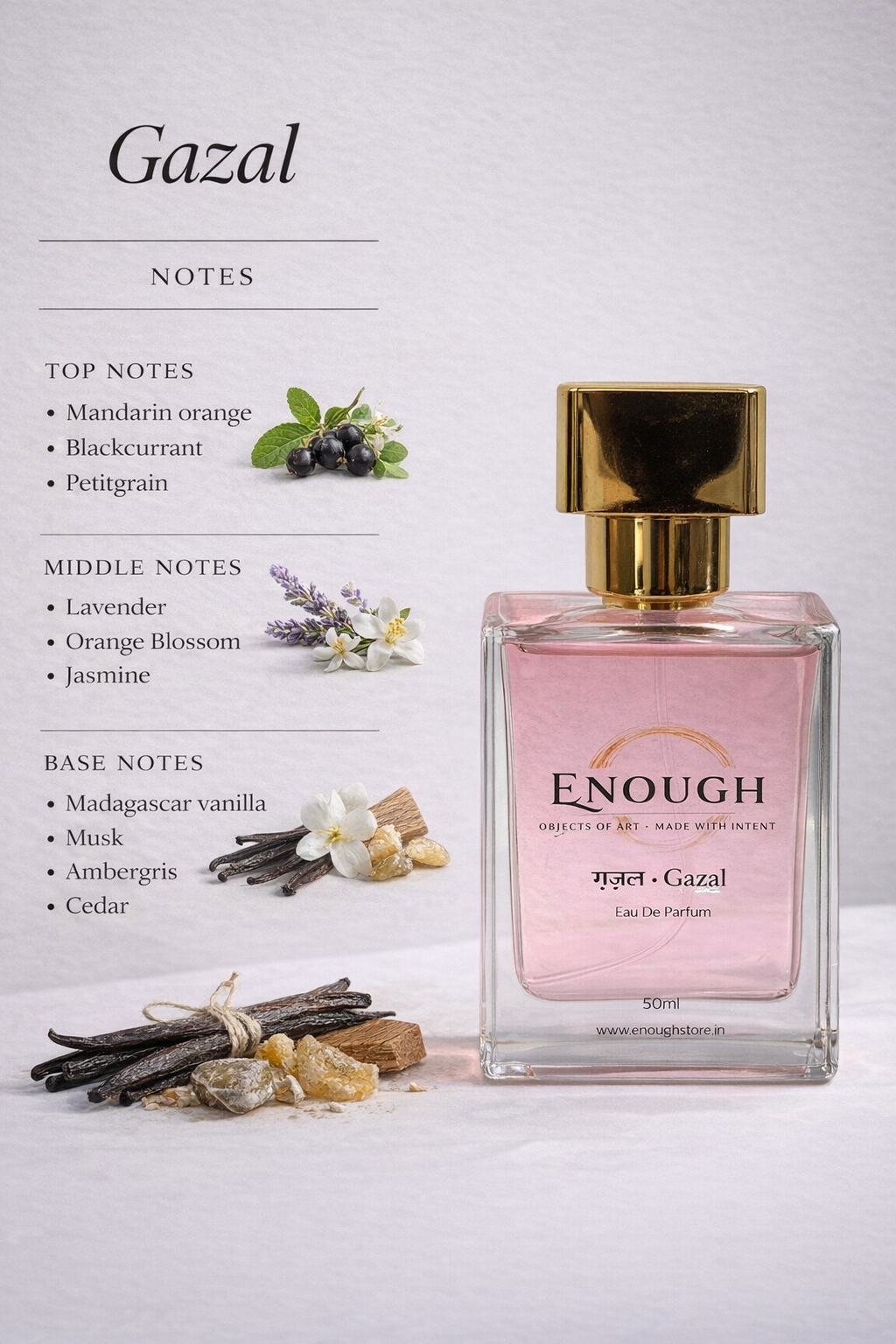 + Free ShippingProduct description -Gazal opens in a luminous bloom of white florals, kissed with bright citrus light. Lavender and soft aromatics drift through the heart, elegant and composed. Vanilla sweetness melts into a powdery warmth, intimate and lingering. Anchored in musky woods with a subtle animalic depth, Gazal whispers long after you’ve gone.